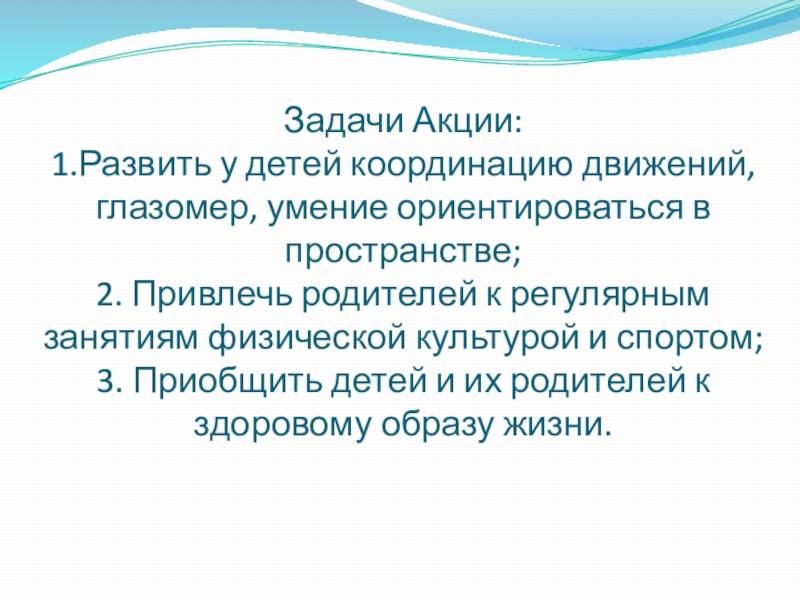 Слайд 11 Задачи Акции: 1.Развить у детей координацию движений, глазомер, умение ориентироваться в пространстве;