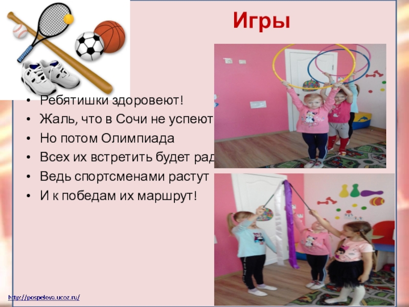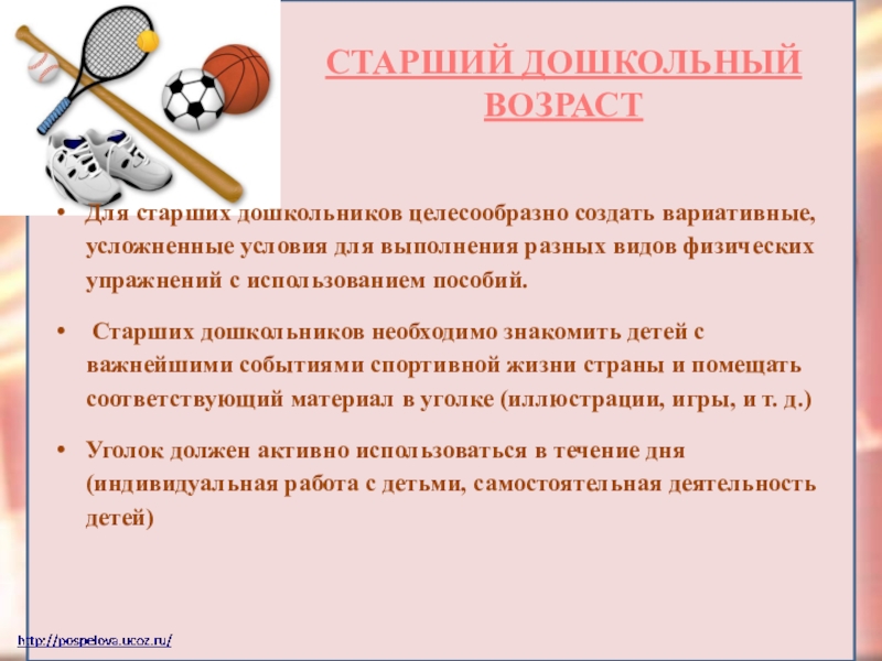 Старших дошкольников необходимо знакомить детей с важнейшими событиями спортивной жизни страны и помещать соответствующий материал в уголке (иллюстрации, игры, и т. д.)
