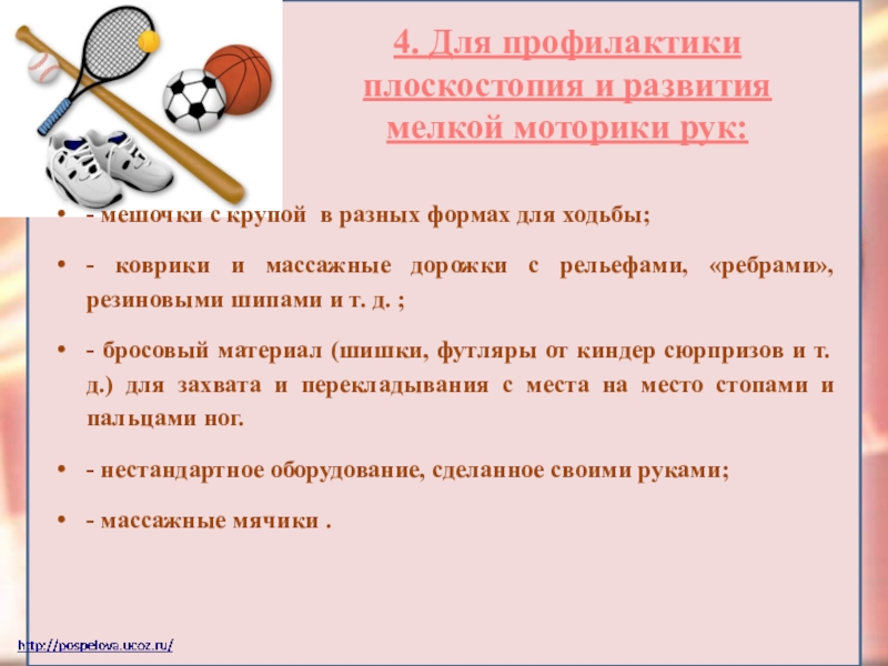 Слайд 84. Для профилактики плоскостопия и развития мелкой моторики рук: