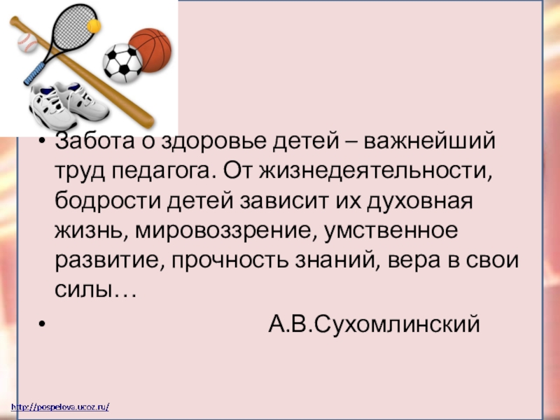 Слайд 17Забота о здоровье детей – важнейший труд педагога. От жизнедеятельности, бодрости