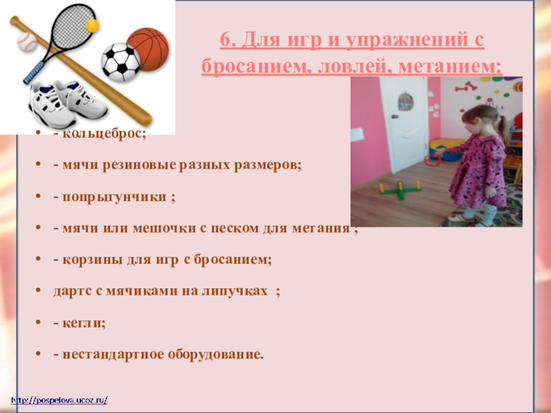 Слайд 106. Для игр и упражнений с бросанием, ловлей, метанием: