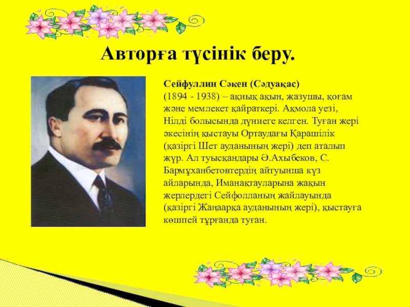 (1894 - 1938) – ақиық ақын, жазушы, қоғам және мемлекет қайраткері. Ақмола уезі, Нілді болысында дүниеге келген. Туған жері әкесінің қыстауы Ортаудағы Қарашілік (қазіргі Шет ауданының жері) деп аталып жүр. Ал туысқандары Ә.Ахыбеков, С.Бармұханбетовтердің айтуынша күз айларында, Иманақтауларына жақын жерлердегі Сейфолланың жайлауында (қазіргі Жаңаарқа ауданының жері), қыстауға көшпей тұрғанда туған.