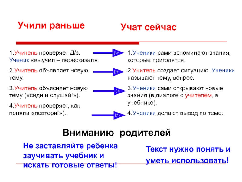 1.Учитель проверяет Д/з. Ученик «выучил – пересказал».