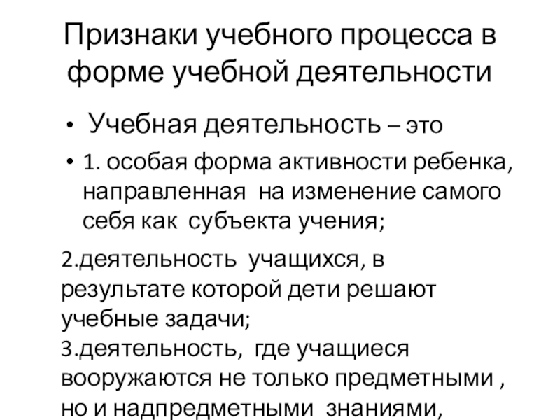 Слайд 13Признаки учебного процесса в форме учебной деятельности: