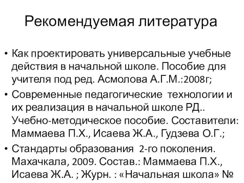 Стандарты образования 2-го поколения. Махачкала, 2009. Состав.: Маммаева П.Х., Исаева Ж.А. ; Журн. : «Начальная школа» № 9, 10, 2004г.