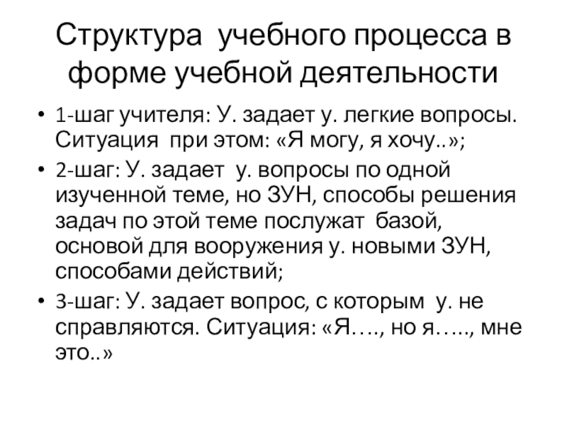 2-шаг: У. задает у. вопросы по одной изученной теме, но ЗУН, способы решения задач по этой теме послужат базой, основой для вооружения у. новыми ЗУН, способами действий;