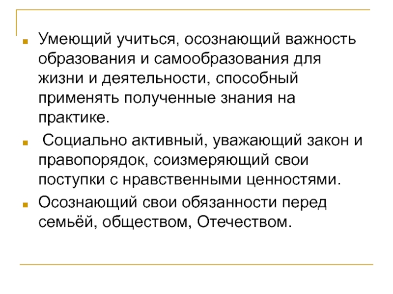 Умеющий учиться, осознающий важность образования и самообразования для жизни и деятельности, способный применять полученные знания на практике.