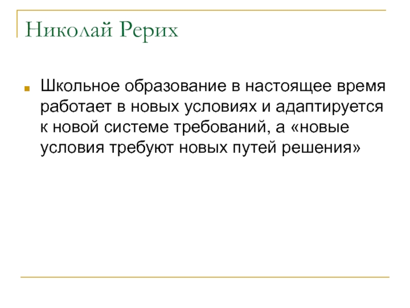 Николай РерихШкольное образование в настоящее время работает в новых условиях и адаптируется к новой системе требований, а «новые условия требуют новых путей решения»