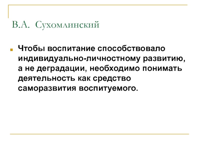 В.А. СухомлинскийЧтобы воспитание способствовало индивидуально-личностному развитию, а не деградации, необходимо понимать деятельность как средство саморазвития воспитуемого.