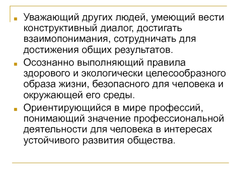 Уважающий других людей, умеющий вести конструктивный диалог, достигать взаимопонимания, сотрудничать для