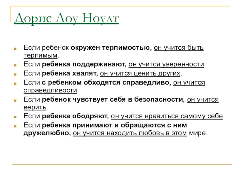 Дорис Лоу Ноулт Если ребенок окружен терпимостью, он учится быть терпимым. Если ребенка поддерживают, он учится уверенности.