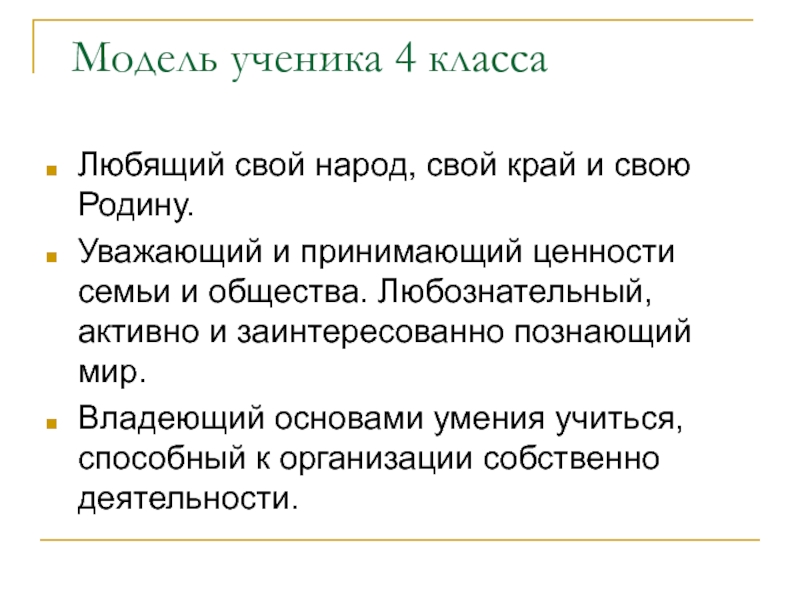 Модель ученика 4 классаЛюбящий свой народ, свой край и свою Родину.Уважающий и принимающий ценности семьи и