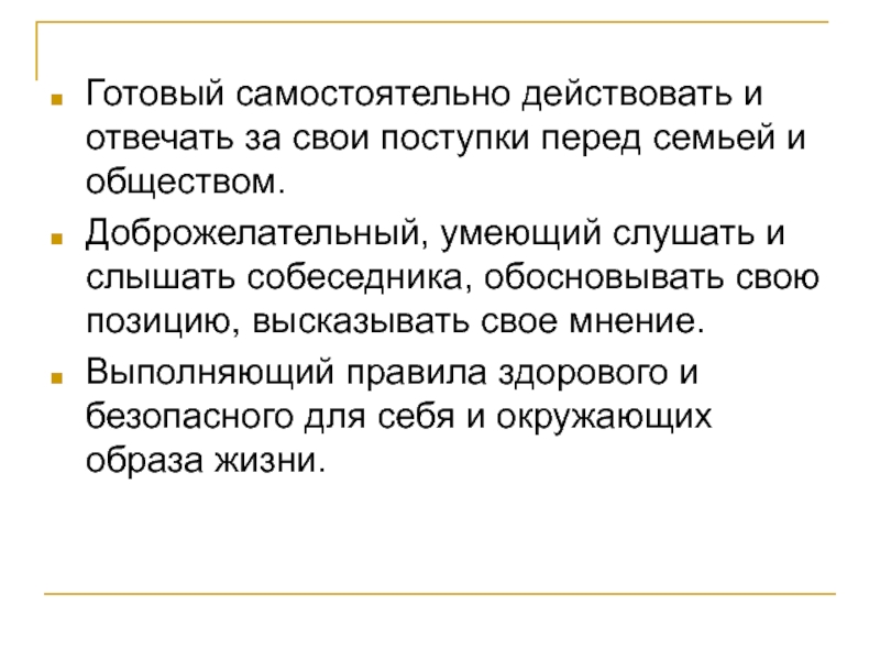 Готовый самостоятельно действовать и отвечать за свои поступки перед семьей и обществом.Доброжелательный, умеющий слушать и слышать собеседника,