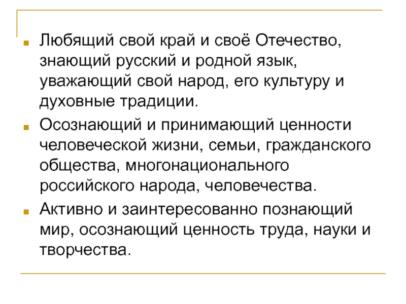 Любящий свой край и своё Отечество, знающий русский и родной язык,