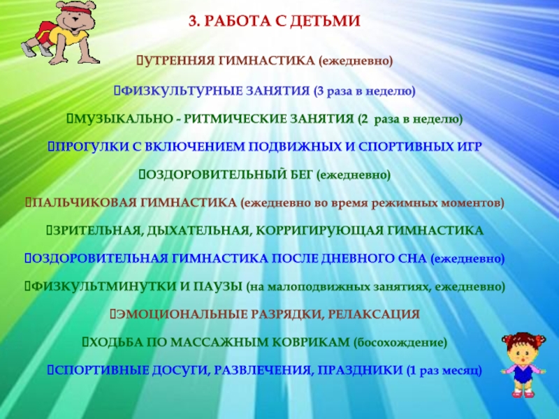 Система становления ценностей здорового образа жизни у детей в ДОУ, представлена следующими мероприятиями: