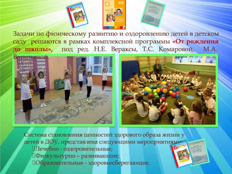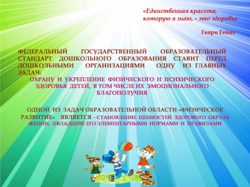ОДНОЙ ИЗ ЗАДАЧ ОБРАЗОВАТЕЛЬНОЙ ОБЛАСТИ «ФИЗИЧЕСКОЕ РАЗВИТИЕ» является - СТАНОВЛЕНИЕ ЦЕННОСТЕЙ ЗДОРОВОГО ОБРАЗА ЖИЗНИ, ОВЛАДЕНИЕ ЕГО ЭЛЕМЕНТАРНЫМИ НОРМАМИ И ПРАВИЛАМИ