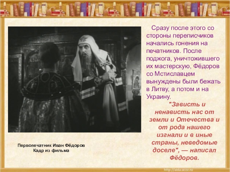 печатников. После поджога, уничтожившего их мастерскую, Фёдоров со Мстиславцем вынуждены были бежать в Литву, а потом и на Украину.