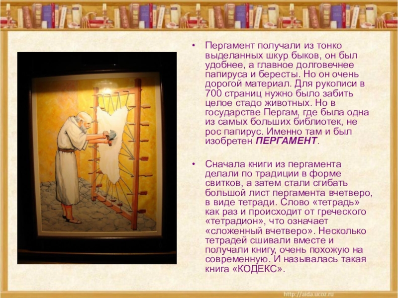 Слайд 11Пергамент получали из тонко выделанных шкур быков, он был удобнее, а