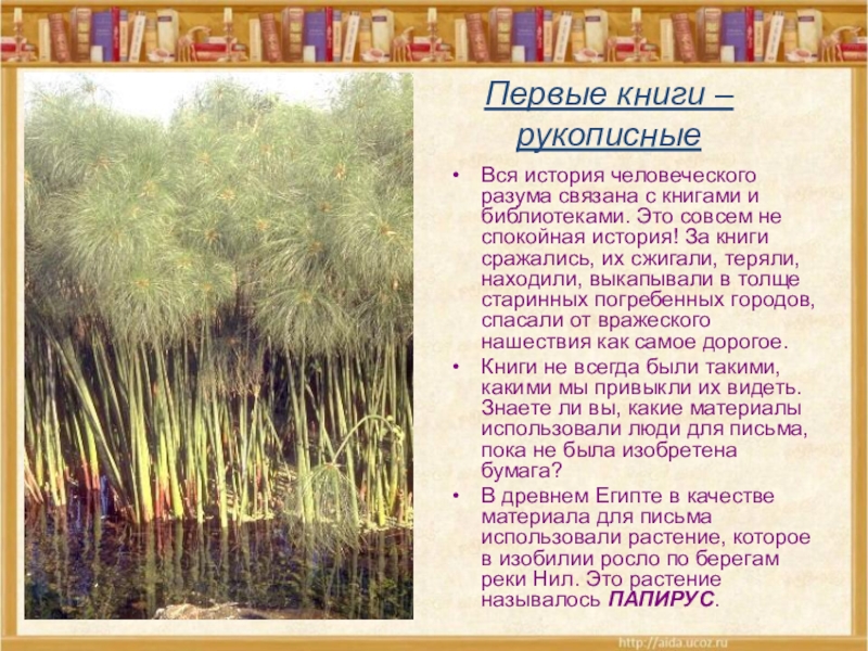 В древнем Египте в качестве материала для письма использовали растение, которое в изобилии росло по берегам реки Нил. Это растение называлось ПАПИРУС.