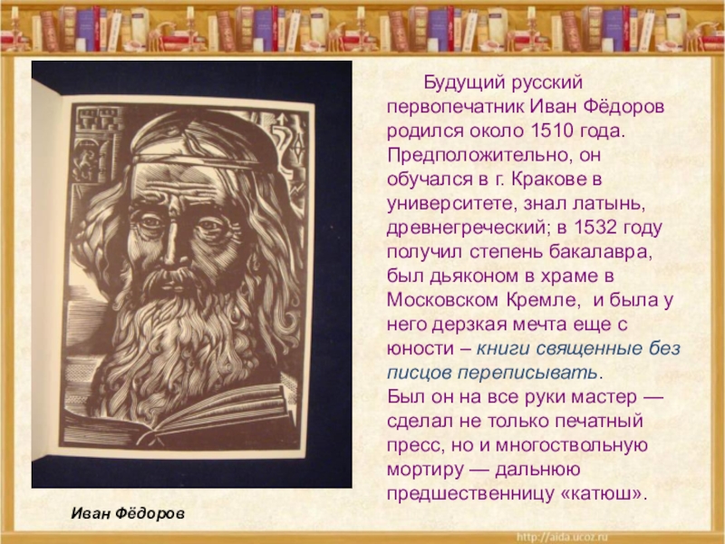 Слайд 18 Будущий русский первопечатник Иван Фёдоров родился около 1510 года. Предположительно, он