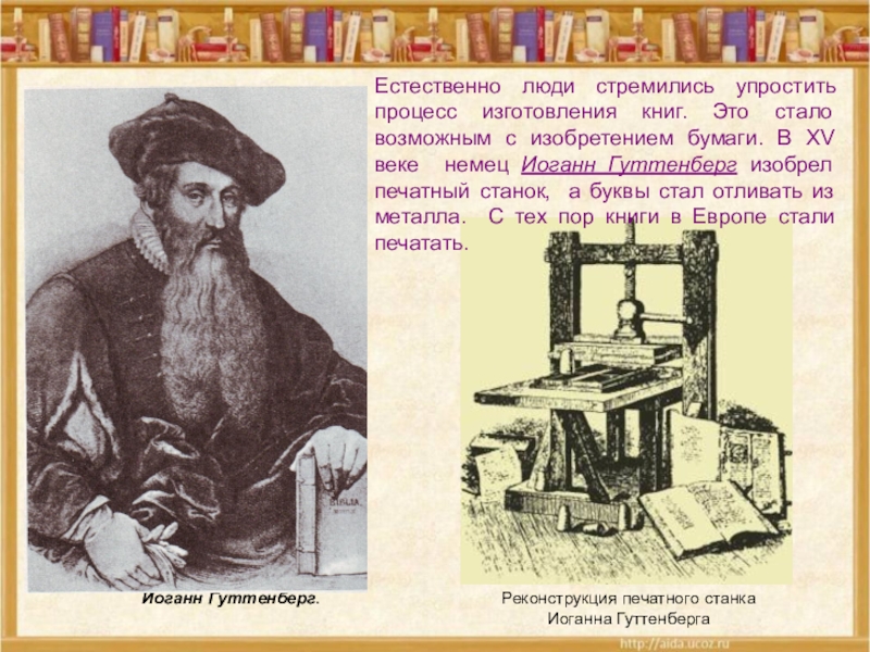 изготовления книг. Это стало возможным с изобретением бумаги. В XV веке немец Иоганн Гуттенберг изобрел печатный станок, а буквы стал отливать из металла. С тех пор книги в Европе стали печатать.