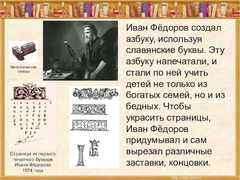 стали по ней учить детей не только из богатых семей, но и из бедных. Чтобы украсить страницы, Иван Фёдоров придумывал и сам вырезал различные заставки, концовки.