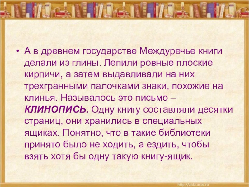 плоские кирпичи, а затем выдавливали на них трехгранными палочками знаки, похожие на клинья. Называлось это письмо – КЛИНОПИСЬ. Одну книгу составляли десятки страниц, они хранились в специальных ящиках. Понятно, что в такие библиотеки принято было не ходить, а ездить, чтобы взять хотя бы одну такую книгу-ящик.