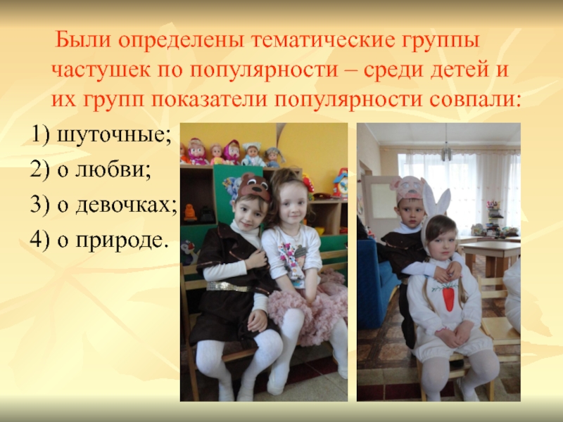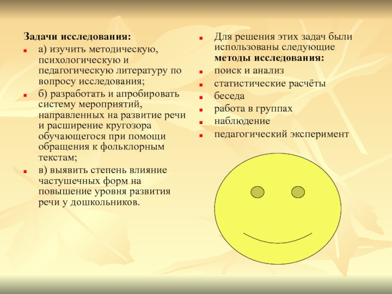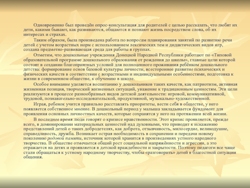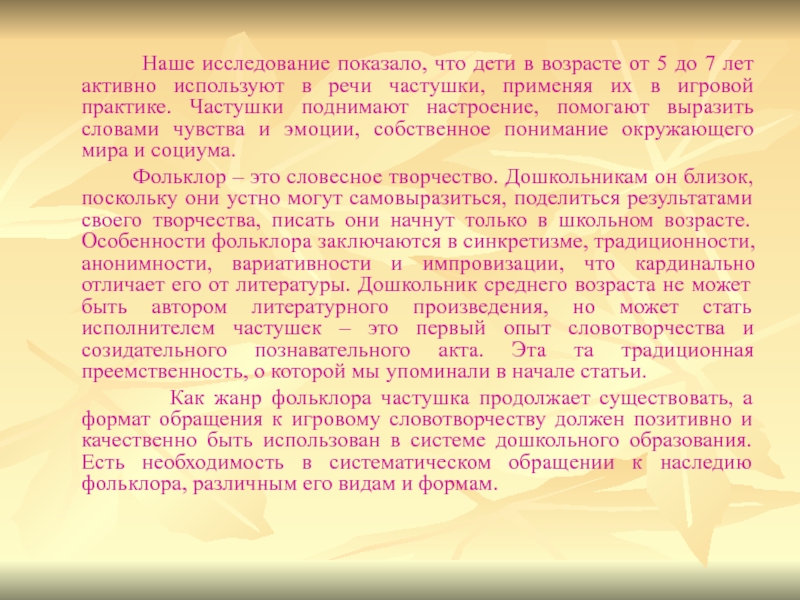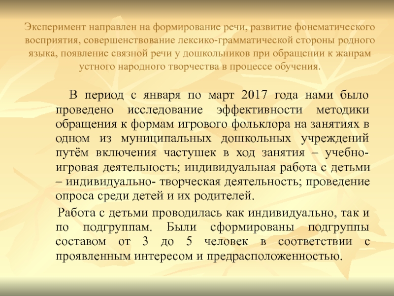 В период с января по март 2017 года нами было проведено исследование эффективности методики обращения к формам игрового фольклора на занятиях в одном из муниципальных дошкольных учреждений путём включения частушек в ход занятия – учебно-игровая деятельность; индивидуальная работа с детьми – индивидуально- творческая деятельность; проведение опроса среди детей и их родителей.