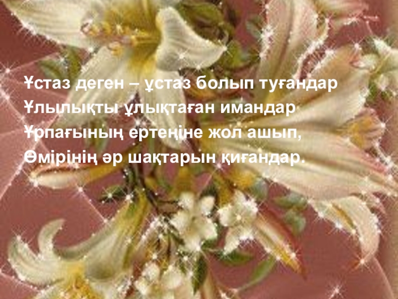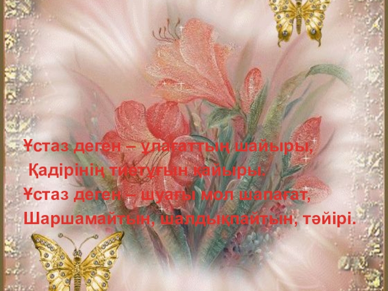 Ұстаз деген – ұлағаттың шайыры, Қадірінің тиетұғын қайыры. Ұстаз деген – шуағы мол шапағат,Шаршамайтын, шалдықпайтын, тәйірі.