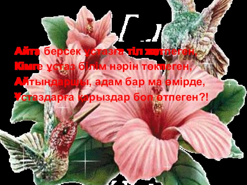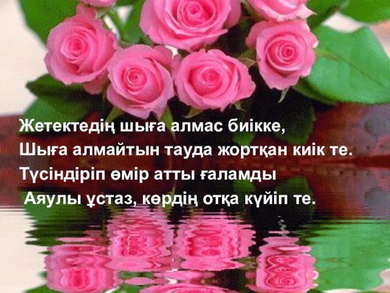 Айта берсек ұстазға тіл жетпеген, Кімге ұстаз білім нәрін төкпеген,Айтыңдаршы, адам бар ма өмірде,Ұстаздарға қарыздар боп өтпеген?!