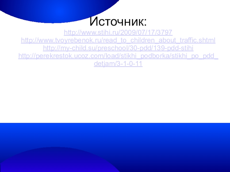 Слайд 22Источник: http://www.stihi.ru/2009/07/17/3797 http://www.tvoyrebenok.ru/read_to_children_about_traffic.shtml http://my-child.su/preschool/30-pdd/139-pdd-stihi http://perekrestok.ucoz.com/load/stikhi_podborka/stikhi_po_pdd_detjam/3-1-0-11