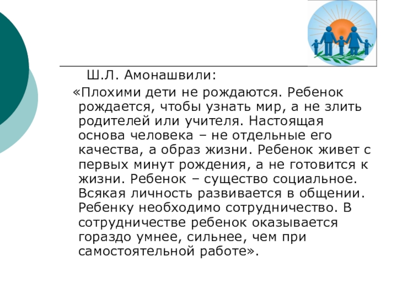 рождается, чтобы узнать мир, а не злить родителей или учителя. Настоящая основа человека – не отдельные его качества, а образ жизни. Ребенок живет с первых минут рождения, а не готовится к жизни. Ребенок – существо социальное. Всякая личность развивается в общении. Ребенку необходимо сотрудничество. В сотрудничестве ребенок оказывается гораздо умнее, сильнее, чем при самостоятельной работе».