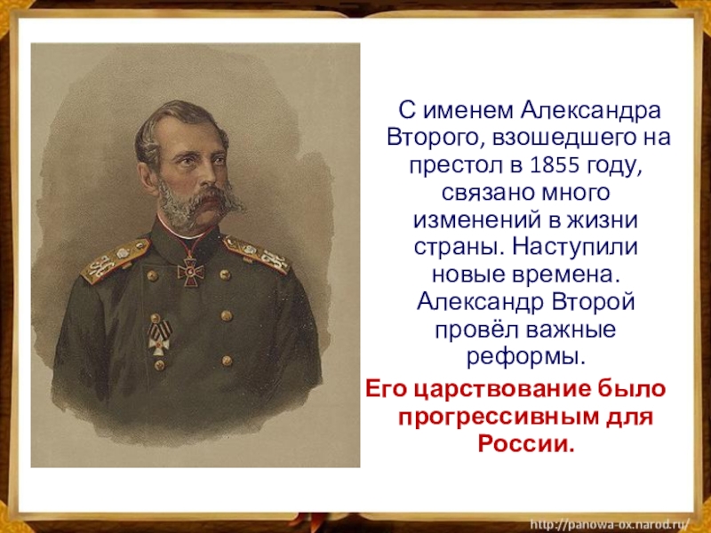 Слайд 20 С именем Александра Второго, взошедшего на престол в 1855 году, связано
