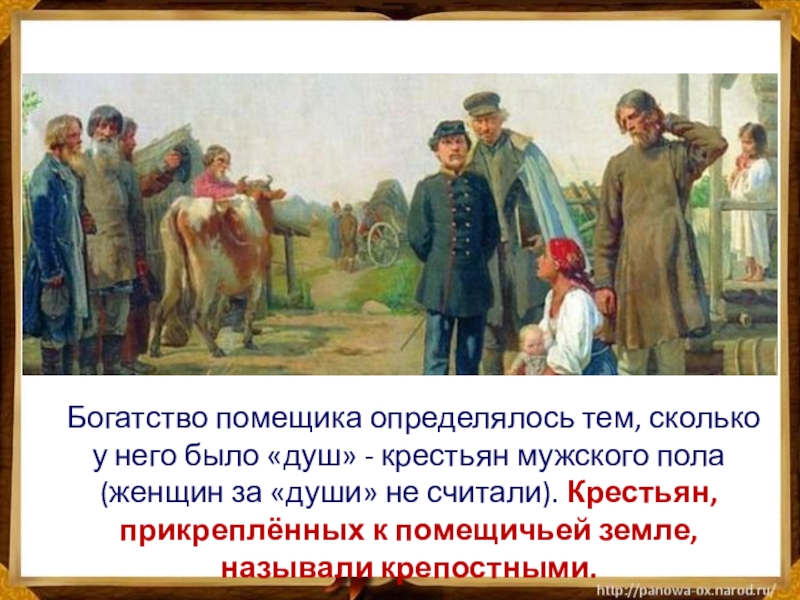 мужского пола (женщин за «души» не считали). Крестьян, прикреплённых к помещичьей земле, называли крепостными.