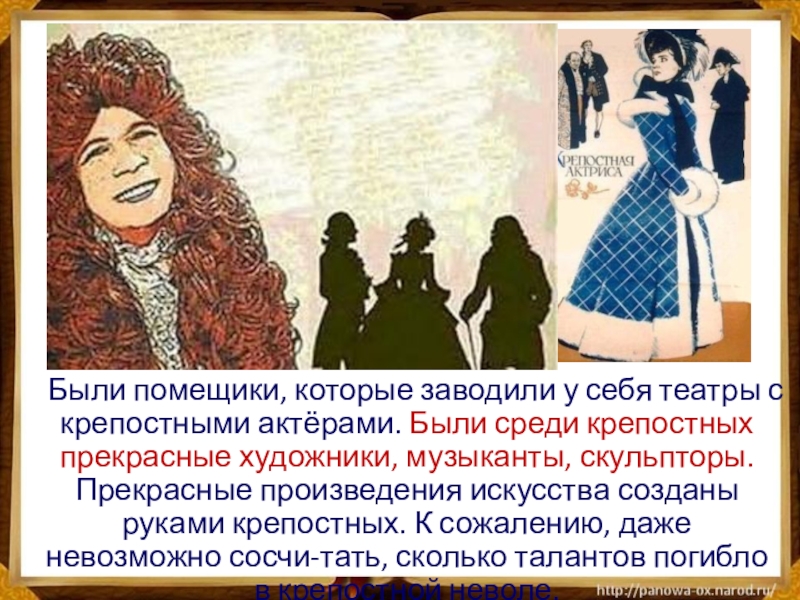 Слайд 15 Были помещики, которые заводили у себя театры с крепостными актёрами. Были