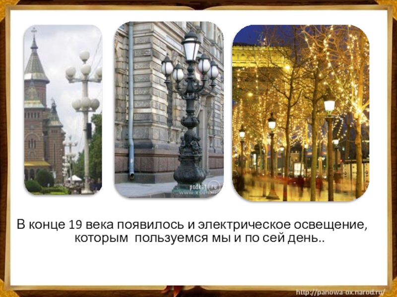 Слайд 28В конце 19 века появилось и электрическое освещение, которым пользуемся мы
