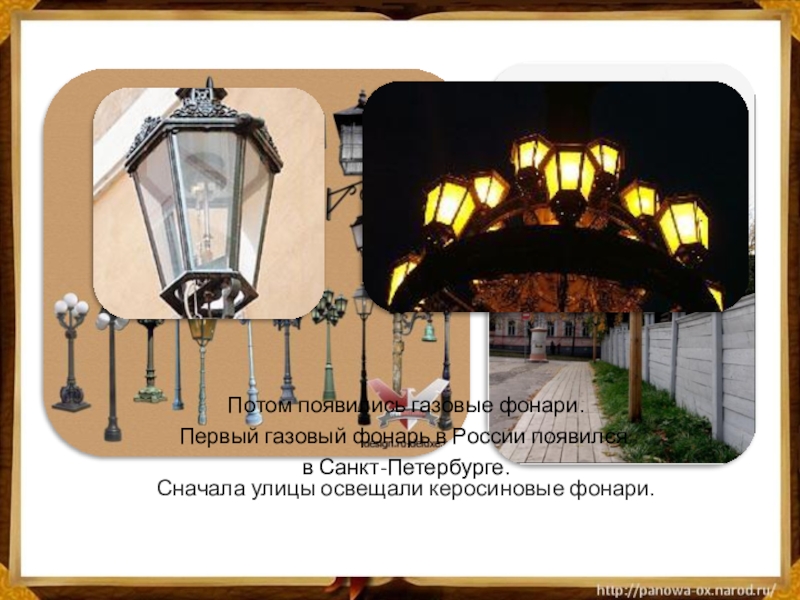 Слайд 27 Сначала улицы освещали керосиновые фонари.