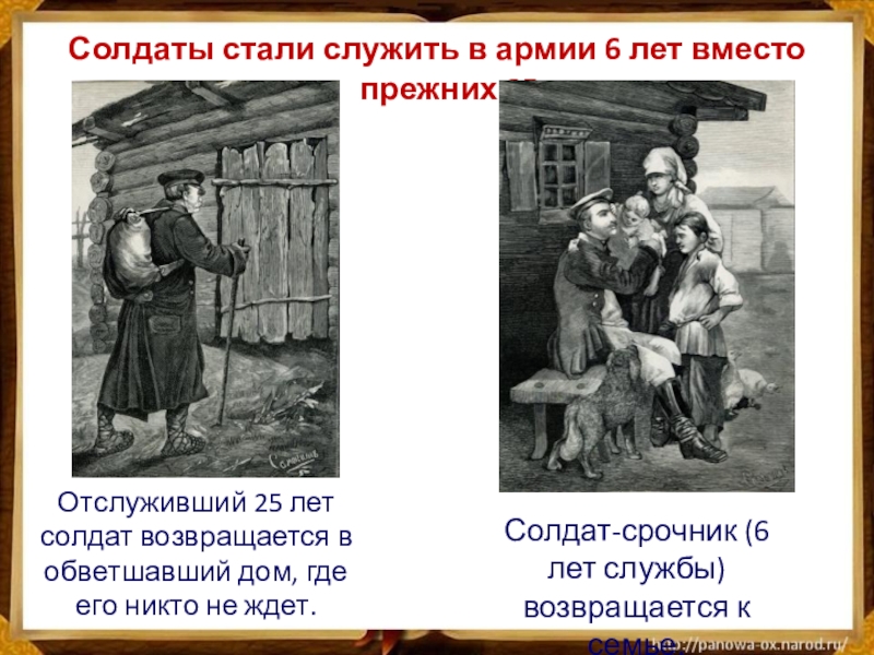 Слайд 32Солдаты стали служить в армии 6 лет вместо прежних 25.