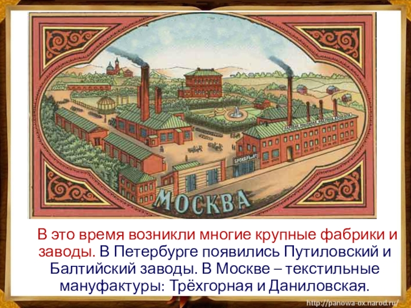 появились Путиловский и Балтийский заводы. В Москве – текстильные мануфактуры: Трёхгорная и Даниловская.