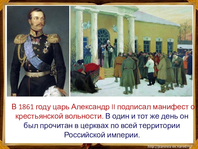 Слайд 17 В 1861 году царь Александр II подписал манифест о крестьянской вольности.