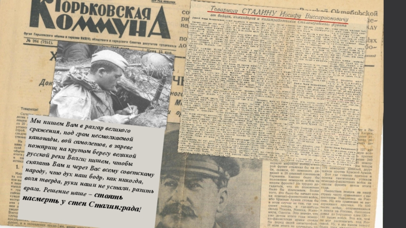 Мы пишем Вам в разгар великого сражения, под гром несмолкаемой канонады, вой самолетов, в зареве пожарищ на крутом берегу великой русской реки Волги; пишем, чтобы сказать Вам и через Вас всему советскому народу, что дух наш бодр, как никогда, воля тверда, руки наши не устали, разить врага. Решение наше – стоять насмерть у стен Сталинграда!
