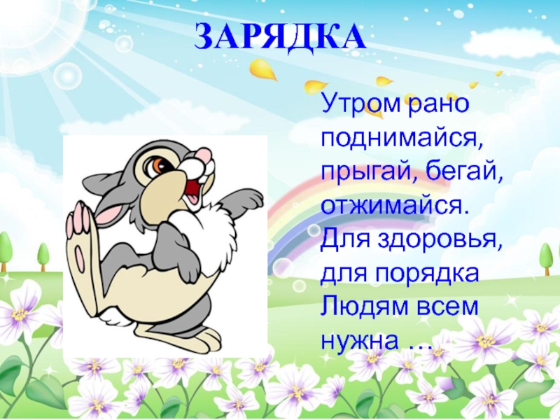 ЗАРЯДКАУтром рано поднимайся,прыгай, бегай, отжимайся.Для здоровья, для порядкаЛюдям всем нужна …