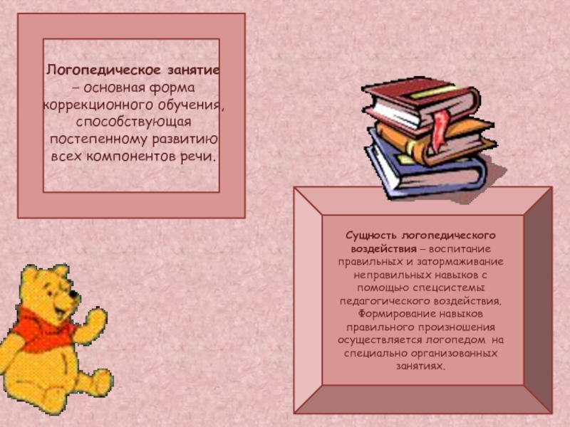 Сущность логопедического воздействия – воспитание правильных и затормаживание неправильных навыков с помощью спецсистемы педагогического воздействия. Формирование навыков правильного произношения осуществляется логопедом на специально организованных занятиях.