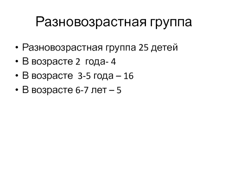 Разновозрастная группаРазновозрастная группа 25 детейВ возрасте 2 года- 4 В возрасте 3-5 года – 16В возрасте 6-7 лет – 5