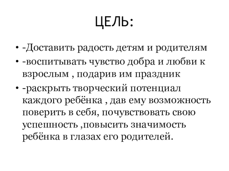 ЦЕЛЬ:-Доставить радость детям и родителям-воспитывать чувство добра и любви к взрослым , подарив им праздник-раскрыть творческий потенциал каждого ребёнка , дав ему возможность поверить в себя, почувствовать свою успешность ,повысить значимость ребёнка в глазах его родителей.