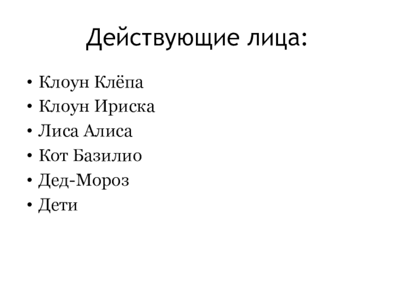 Действующие лица:Клоун КлёпаКлоун ИрискаЛиса АлисаКот БазилиоДед-МорозДети