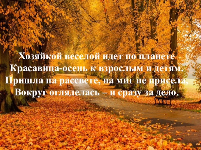 Слайд 2Хозяйкой веселой идет по планете Красавица-осень к взрослым и детям. Пришла на рассвете,