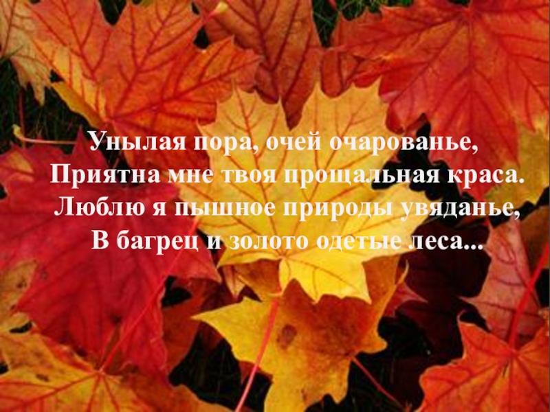 Унылая пора, очей очарованье, Приятна мне твоя прощальная краса. Люблю я пышное природы увяданье, В