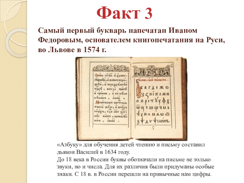 «Азбуку» для обучения детей чтению и письму составил дьякон Василий в 1634 году.