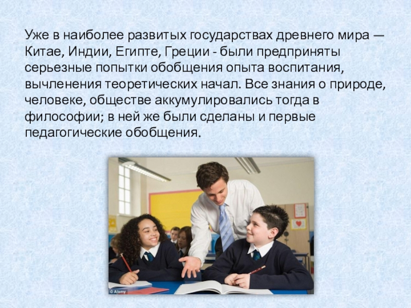 Греции - были предприняты серьезные попытки обобщения опыта воспитания, вычленения теоретических начал. Все знания о природе, человеке, обществе аккумулировались тогда в философии; в ней же были сделаны и первые педагогические обобщения.